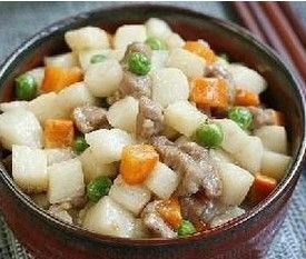 胡蘿卜,白山藥,豌豆,牛肉,淀粉,胡椒粉,醬油,料酒,油,蔥,姜,味精,鹽