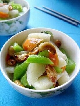 小貼士:萵筍含鉀量較高,有利于促進(jìn)排尿,對(duì)高血壓和心臟病極為有益。能改善消化系統(tǒng),增進(jìn)食欲山藥有健脾,除濕,補(bǔ)氣,益肺,固腎,益精的功效。含有可溶性纖維,能助消化,降血糖 腰果含有豐富的油脂,可以潤(rùn)腸通便,潤(rùn)膚美容,延緩衰老。經(jīng)常食用可以提高機(jī)體抵抗力。