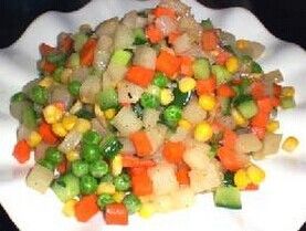 4、汆燙過的五彩粒已經呈半熟狀態,所以烹炒時間不易過長,以免失去爽脆之口感;