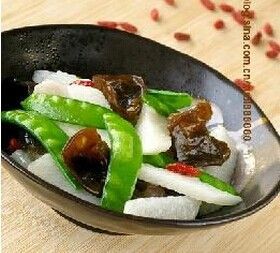 山藥200克、荷蘭豆50克、黑木耳3朵、枸杞10克、鹽1茶勺、油20克